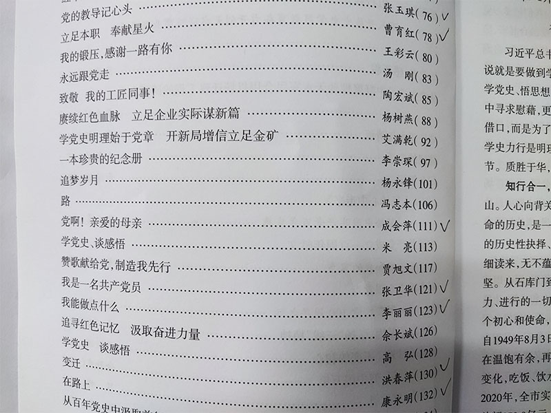 在2021年慶祝建黨100周年之際,天水市國(guó)資委、企工委組織開(kāi)展了“學(xué)黨史、談感悟”征文活動(dòng)。日前,主辦單位已將評(píng)選的42篇優(yōu)秀作品結(jié)集成冊(cè),其中星火機(jī)床公司七名職工的征文被收入其中。他們分別是退休職工張玉琪的《黨的教導(dǎo)記心頭》、物業(yè)公司曹育紅的《立足本職 奉獻(xiàn)星火》、行政綜合管理部成會(huì)萍的《黨啊!親愛(ài)的母親》、鑄造公司張衛(wèi)華的《我是一名共產(chǎn)黨員》、物業(yè)公司李麗麗的《我能做點(diǎn)什么》、機(jī)床研究院洪春萍的《變遷》和黨群工作部康永明的《在路上》。