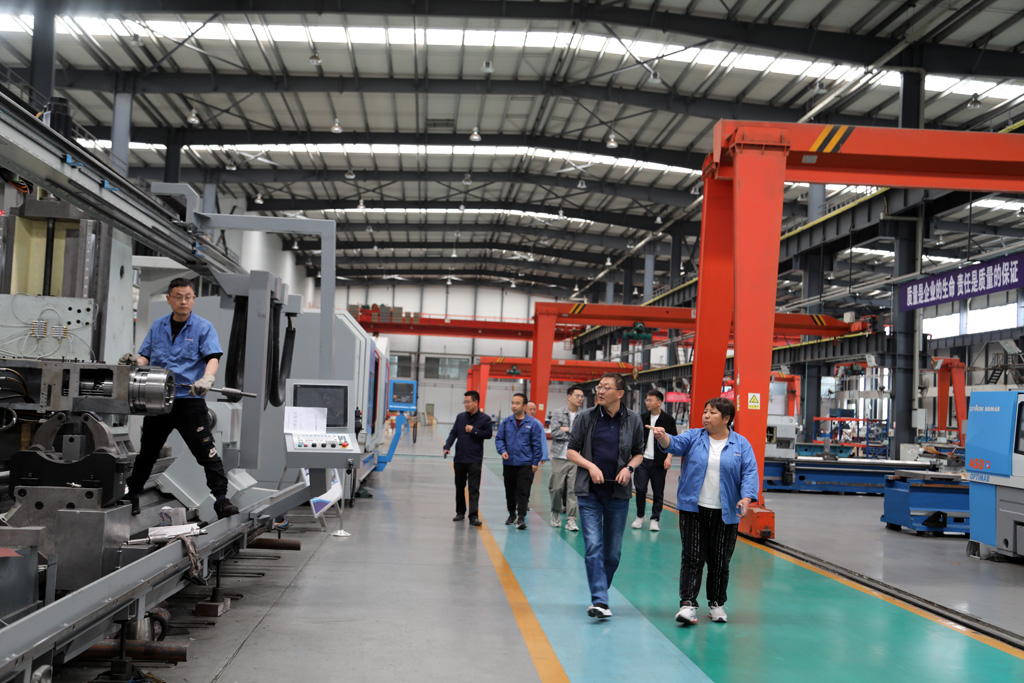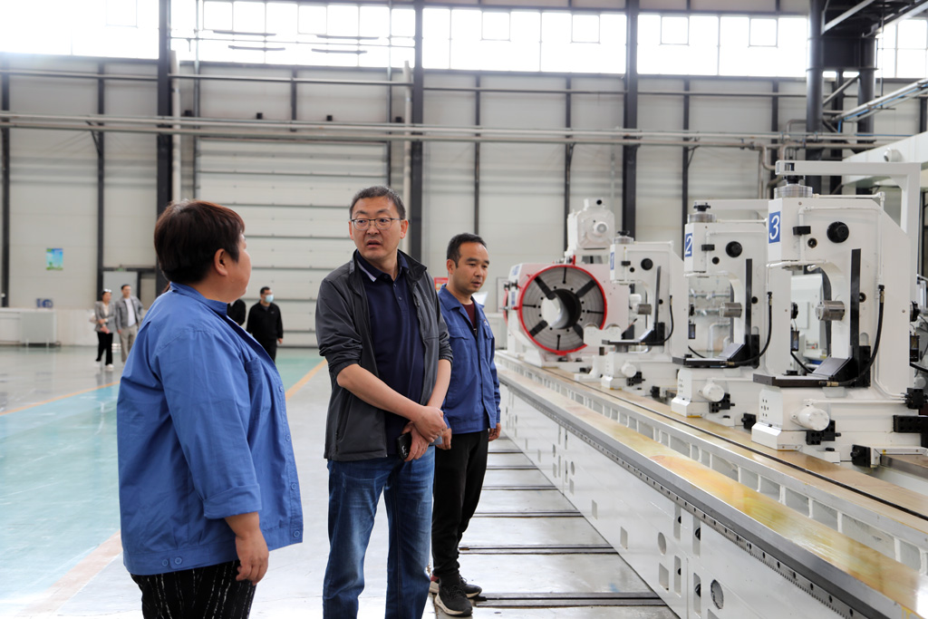 藺峰一行深入生產(chǎn)車間裝配現(xiàn)場,參觀生產(chǎn)場景和公司特色創(chuàng)新產(chǎn)品,在參觀調(diào)研中,展海瑜重點介紹了公司技術創(chuàng)新和發(fā)展經(jīng)營等情況,對公司自主研發(fā)生產(chǎn)的高端數(shù)控纏繞機床、高精度大型數(shù)控軋輥磨床、大型五軸聯(lián)動機床、船舶用超大直徑筒體加工專用機床等各類產(chǎn)品的特點、用途、應用領域及市場前景做了詳細講解。并就目前產(chǎn)業(yè)政策、產(chǎn)業(yè)集群和產(chǎn)業(yè)協(xié)同發(fā)展等方面問題與藺峰一行作了深入交流。