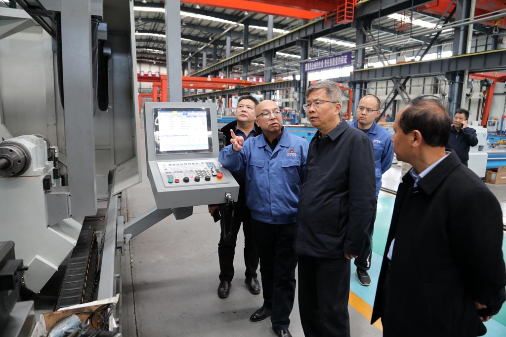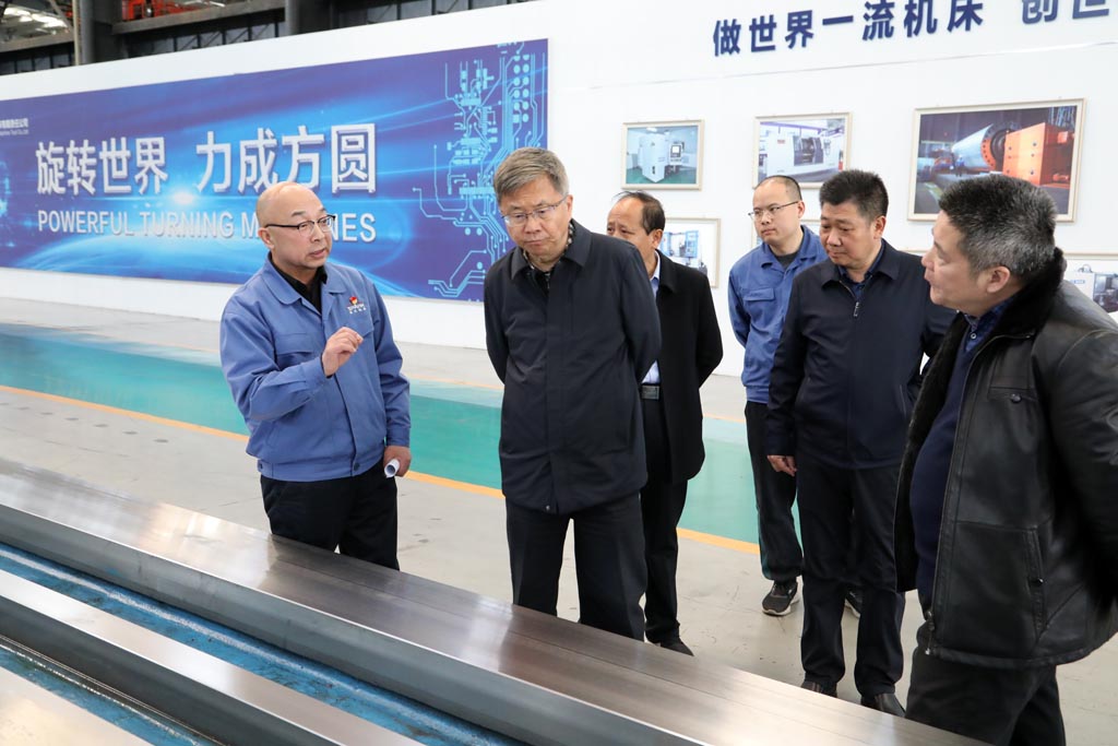 蔣俊、展海瑜陪同李斌一行首先深入工業(yè)園裝配現(xiàn)場,參觀了星火機床公司研發(fā)生產(chǎn)的大型數(shù)控機床、重型機床及星火青重公司生產(chǎn)的車輪車床等產(chǎn)品,介紹了各種機床產(chǎn)品的特點、用途和市場前景。隨后,前往加工車間參觀了公司主要生產(chǎn)設(shè)備。調(diào)研中,蔣俊匯報了企業(yè)近幾年的生產(chǎn)經(jīng)營指標(biāo)、今年計劃、科技創(chuàng)新、改革改制和未來發(fā)展規(guī)劃等。